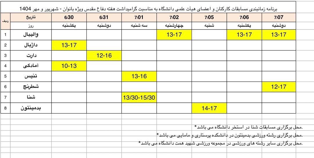 به گزارش روابط عمومی مدیریت امور پشتیبانی و رفاهی دانشگاه،به مناسبت گرامیداشت هفته دفاع مقدس، مسابقات شنای بانوان روز سهشنبه ۱ مهرماه از ساعت ۱۳ الی ۱۶ در استخر مجموعه ورزشهای آبی دانشگاه، با حضور پرشور کارکنان مراکز مختلف تابعه، در دو رده سنی و در رشتههای تخصصی کرال سینه و شنای قورباغه برگزار شد.